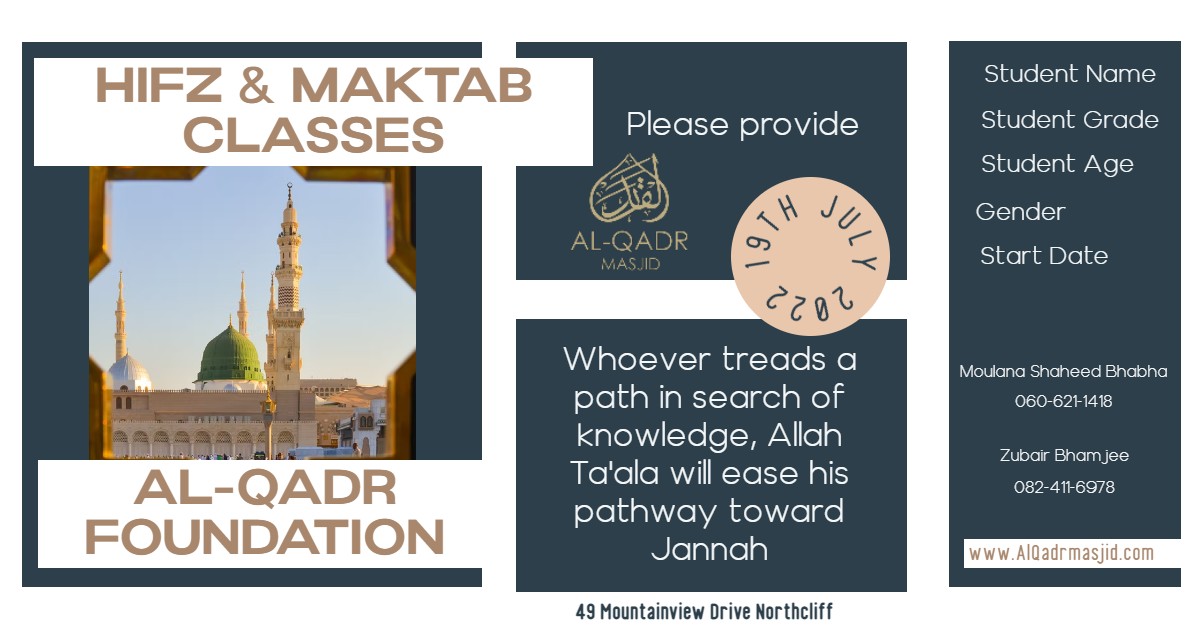 With the growing number of Muslim families moving into the Berario, Fairlands and surrounding suburbs, it has prompted the need for the establishment of the Al-Qadr Masjid.